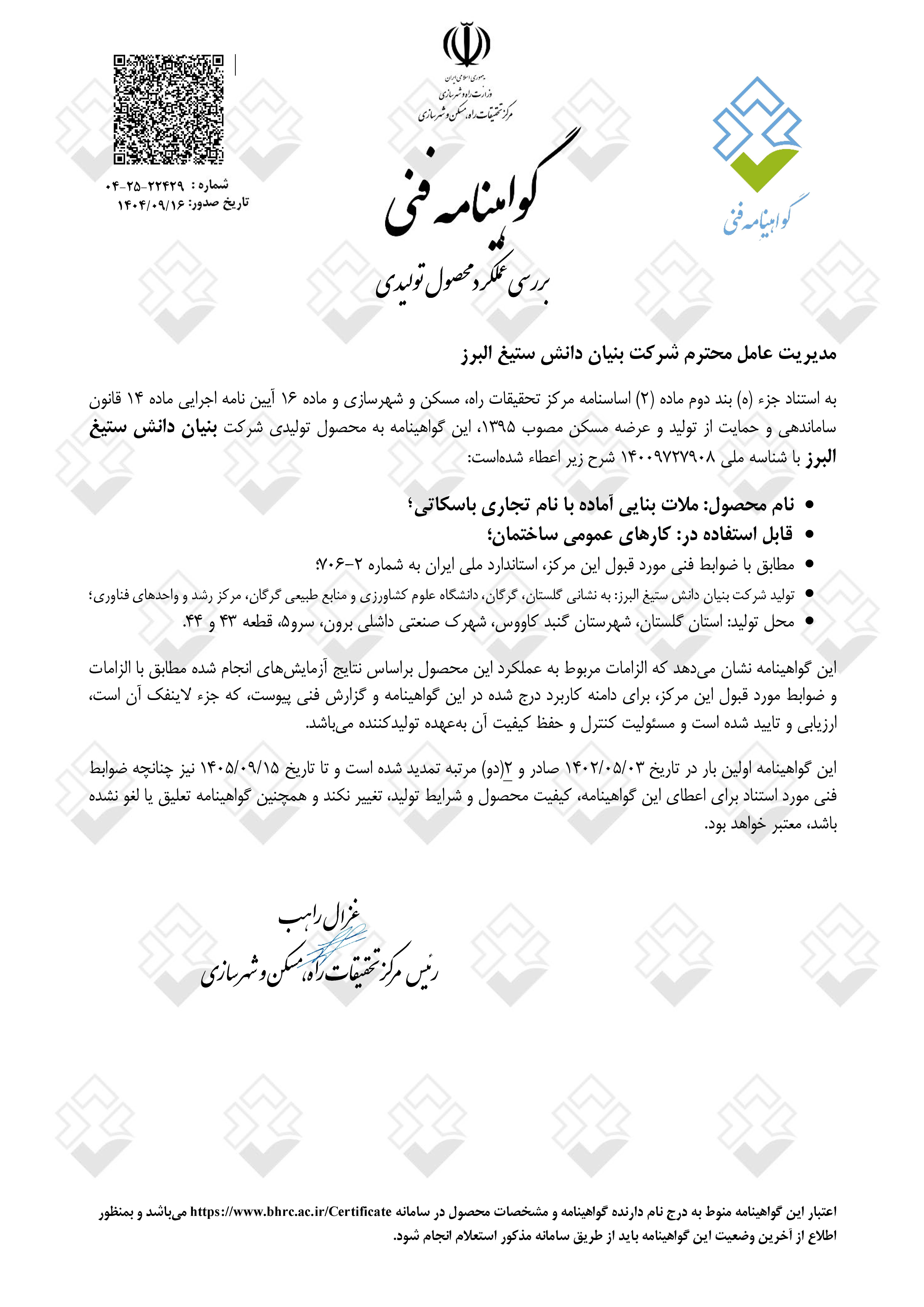 گواهینامه فنی ملات دیوارچینی گواهینامه فنی آب بند دو جزئی گواهینامه فنی اندود بیرونی